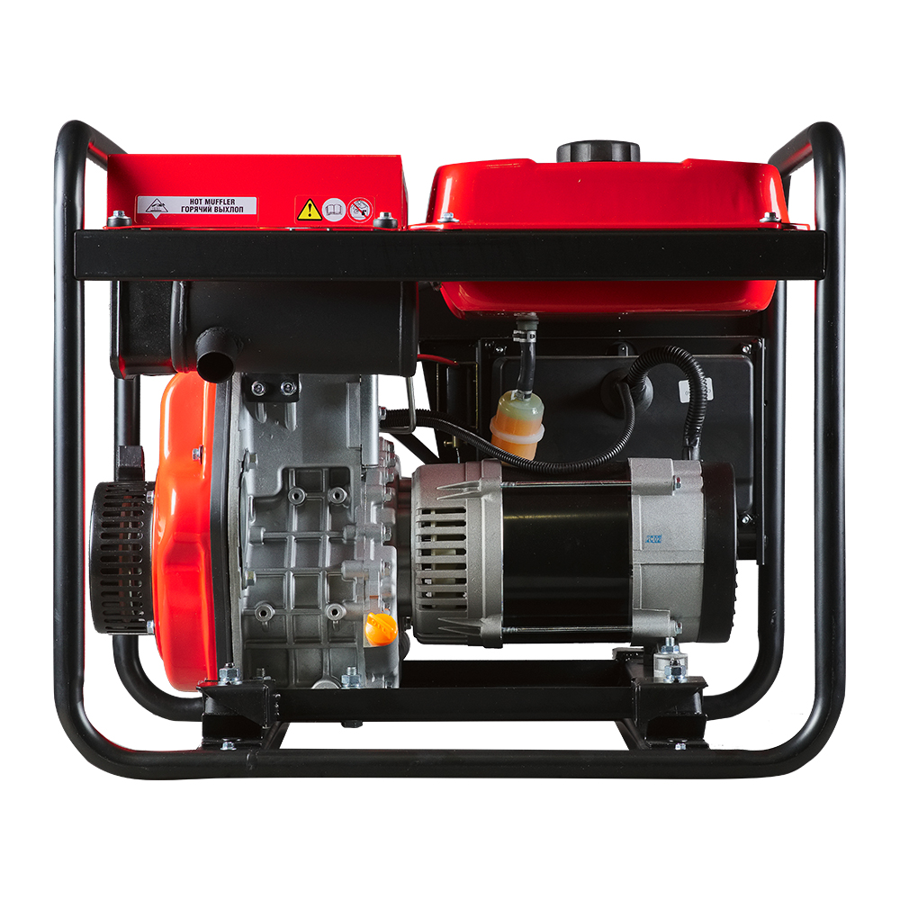 Надежный дизельный OHV-двигатель обеспечит высокий ресурс работы устройства. Асинхронный альтернатор с алюминиевыми обмотками ротора и статора оснащен системой регулировки выходного напряжения (AVR), что гарантирует стабильное выходное напряжение и частоту тока. Двигатель и альтернатор установлены на раму через демпферы, позволяющие значительно гасить вибрации во время работы и перемещения оборудования, увеличивая долговечность конструкции.